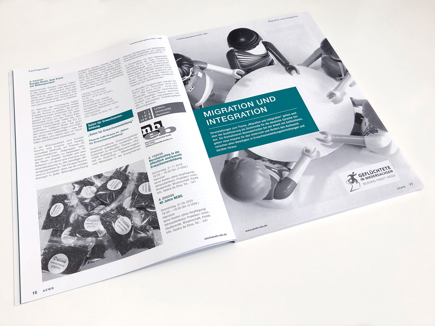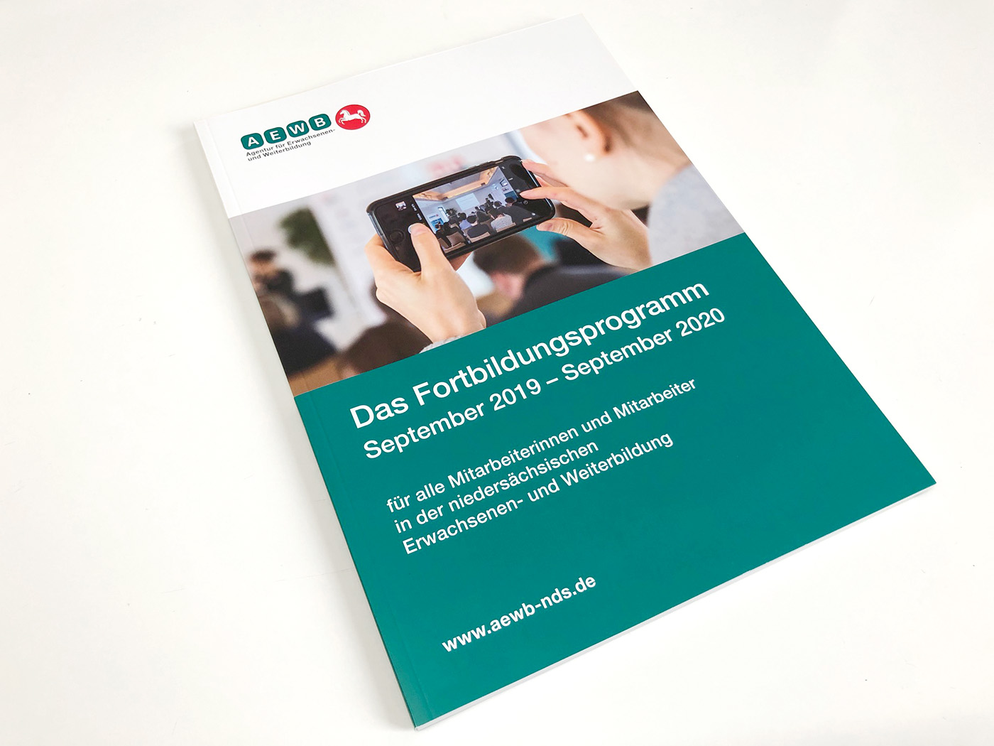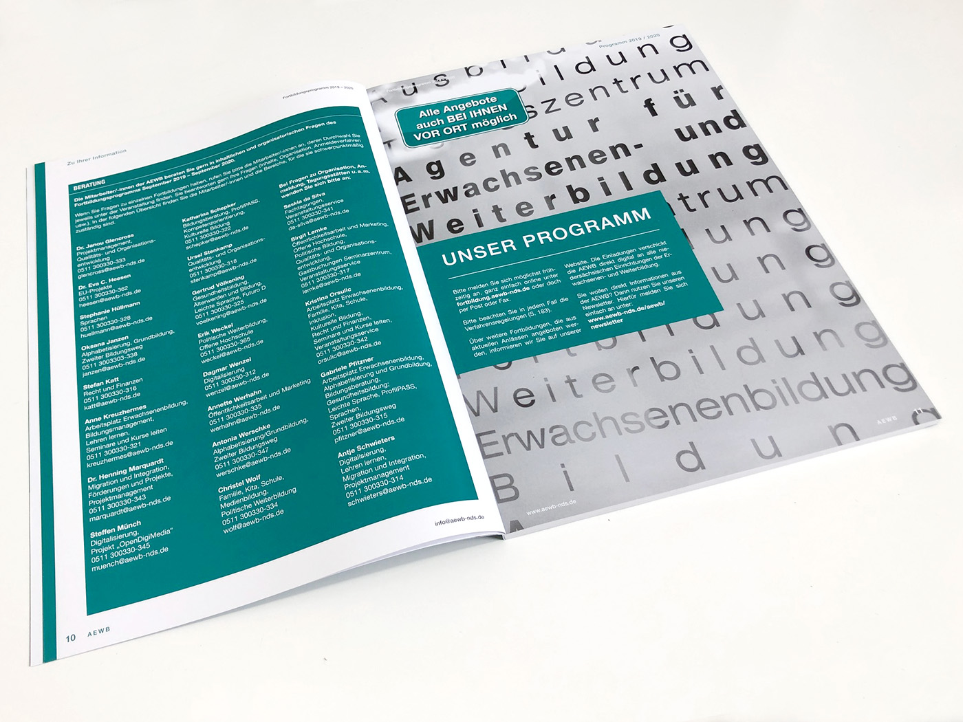 Die Agentur für Erwachsenen- und Weiterbildung (AEWB) ist seit 2006 der zentrale Dienstleister und Service-Anbieter für die Erwachsenenbildung in Niedersachsen für alle anerkannten, öffentlich geförderten Einrichtungen und ihre Mitarbeiterinnen und Mitarbeiter. Für die AEWB haben wir das komplette Fortbildungs-Programm neu gestaltet. Mit einer klaren Bildsprache und einer übersichtlichen Textstruktur ist das komplette Kursprogramm leicht erfassbar und übersichtlich gegliedert. Der 2-farbige Innenteil unterstützt diese klare Linie.