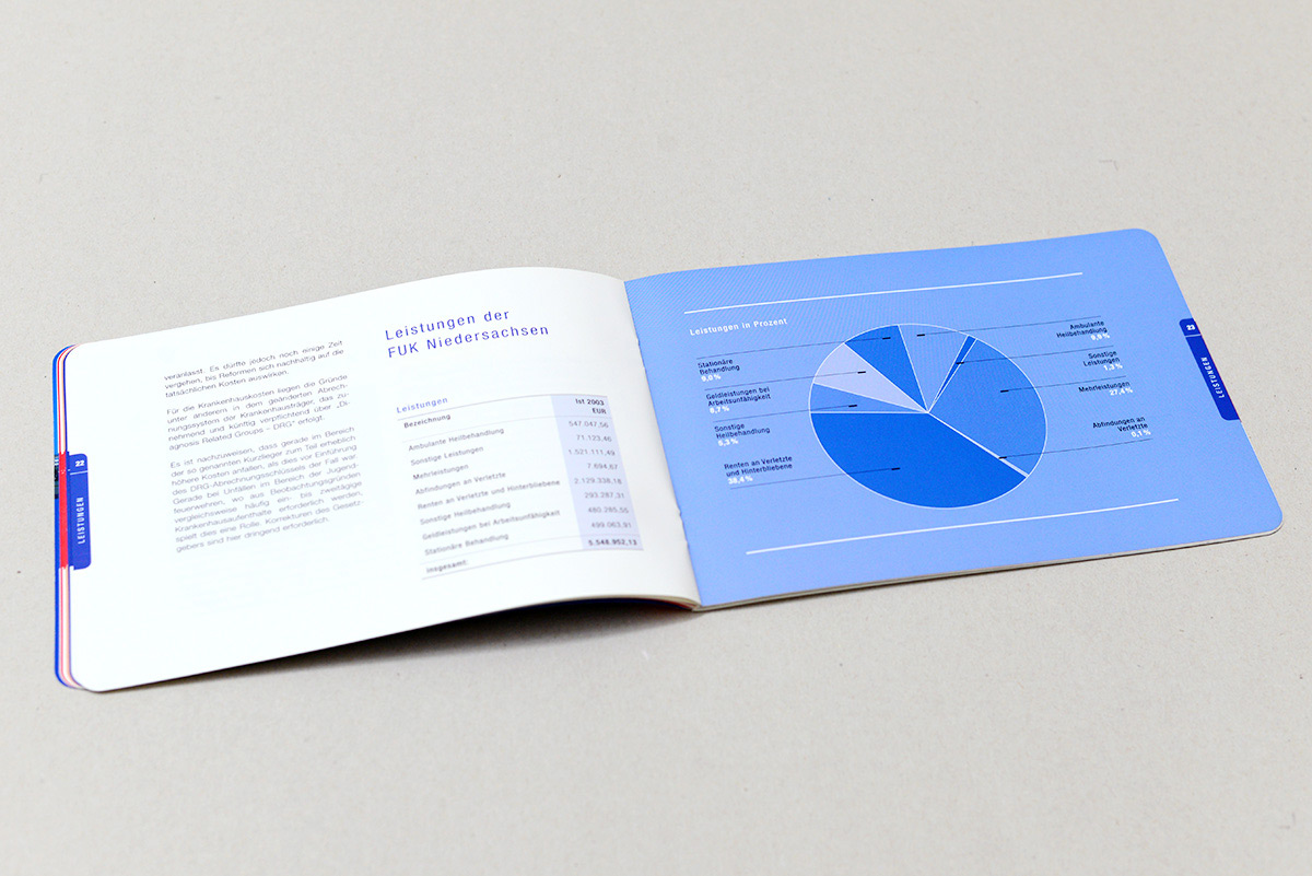 Die Feuerwehr-Unfallkasse Niedersachse (FUK) ist gesetzliche Unfallversicherungsträgerin und damit Teil des deutschen Sozialversicherungssystems. Sie ist vom Land Niedersachsen als landesunmittelbare Körperschaft des öffentlichen Rechts mit Selbstverwaltung errichtet worden. Für diesen Kunden haben wir neben der "FUK news" auch den Geschäftsbericht gestaltet. Um das Heft deutlich von den üblichen Periodika abzugrenzen, wurde es zusätzlich mit Stanzung und Prägung versehen.