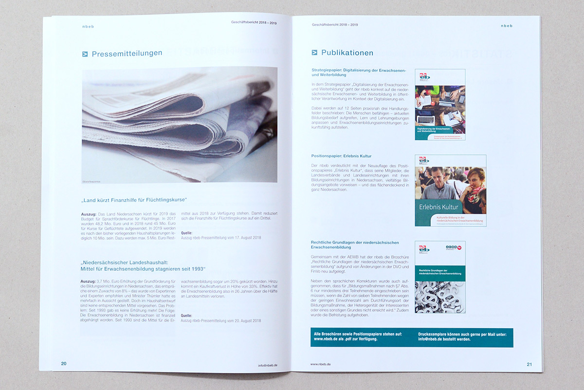 Der Niedersächsische Bund für freie Erwachsenenbildung e.V. (nbeb) ist der Fach- und Interessenverband der Erwachsenen- und Weiterbildung in öffentlicher Verantwortung. Der Bund vertritt die bildungspolitischen Interessen seiner neun Mitgliedsorganisationen – bestehend aus den drei Säulen: Volkshochschulen, Heimvolkshochschulen und sieben Landeseinrichtungen. Der Geschäftsbericht umfasst Informationen über Vorstandsmitglieder, Sitzungen und die Mitgliedschaften in Beiräten. Der Themenschwerpunkt liegt dabei auf der politischen Arbeit im Sinne der Erwachsenenbildung.